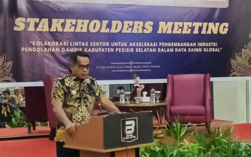 Wakil Bupati Pesisir Selatan, Risnaldi Ibrahim, menyampaikan komitmen tersebut dalam kegiatan Stakeholders Meeting yang digelar di Grand Basko Hotel Padang, Kamis (6/11/2025) malam. Pertemuan ini dihadiri perwakilan dari Kementerian Perdagangan RI, Kementerian Pertanian RI, OPD provinsi dan kabupaten, akademisi, lembaga perbankan, serta para pelaku usaha dan industri gambir.