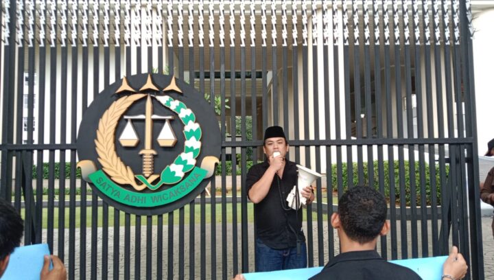 Direktur LAKI, Ridwan Umar (Jaket Merah) Memimpin massa aksi di Kejagung RI