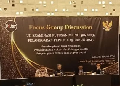 NasionalPos.com, Yogyakarta- Para akademisi dan pemerhati bidang hukum dari Yogyakarta menggelar Forum Group Discussion (FGD) yang bertema “Uji Examinasi Putusan Mahkamah Konstitusi (MK) Nomor 90 Tahun 2023 terkait Batas Usia Calon Presiden dan Calon Wakil Presiden” dalam Pemilu, Pelanggaran Peraturan Komisi Pemilihan Umum (PKPU) Nomor 19 Tahun 2023″.