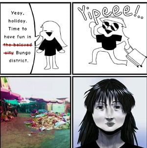 Sistem pengelolaan sampah di kota Muara Bungo, lanjut Gena, dimulai dari sampah rumah tangga, restoran, pertokoan, gudang dan pasar. Selanjutnya sampah dibuang ke Tempat Pembuangan Sementara (TPS) yang berada di perumahan, pertokoan dan pasar tradisional yang diangkut dengan menggunakan sepeda motor roda tiga, truk dan terakhir dibawa ke Tempat Pembuangan Terakhir (TPA) di Dusun Senamat, namun agar lebih obyektif informasi tersebut, kemudian dirinya  langsung terjun berdiskusi bukan hanya Kepala Bidang Kebersihan, Dinas Lingkungan Hidup Kabupaten Bungo H. Zulkarnaen SiP., M.Si., melainkan juga berdiskusi dengan masyarakat, salah satu diantaranya adalah pemilik Vania Cake Café yakni  Cicilia Endang.