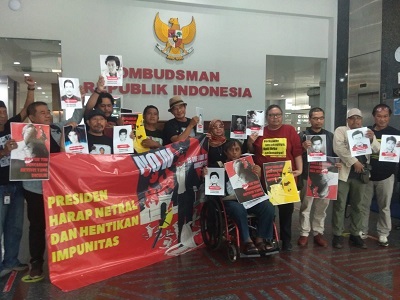 NasionalPos.com, Jakarta- Sebanyak 50-an orang dari Forum Rakyat Demokratik untuk Keadilan Korban Penghilangan Paksa, Ikatan Keluarga Orang Hilang Indonesia (IKOHI) dan Kawan’98 mendatangi kantor Ombudman Republik Indonesia, Kamis, 18/1/2024 untuk mengadukan Presiden Jokowi ke Ombudsman, lantaran selama 9 tahun pemerintahannya telah mengabaikan Rekomendasi DPR RI tahun 2009,