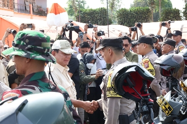 Tidak hanya meninjau, Menhan Prabowo juga menyerahkan bantuan 35 unit sepeda motor untuk prajurit TNI dan Polri.