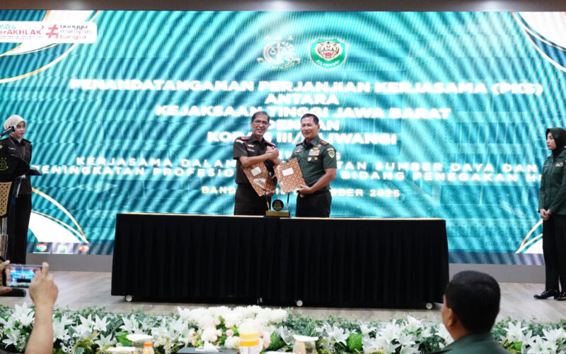 Bandung, NasionalPos.com – Pangdam III/Siliwangi Mayjen TNI Kosasih, S.E., bersama Kepala Kejaksaan Tinggi (Kajati) Jawa Barat Dr. Hermon Dekristo, S.H., M.H., melaksanakan Penandatanganan Perjanjian Kerja Sama (PKS). Antara Kodam III/Siliwangi dan Kejaksaan Tinggi Provinsi Jawa Barat dalam pemanfaatan sumber daya dan peningkatan profesionalisme di bidang penegakan hukum. Yang berlangsung di Aula Lantai 8 Kantor Kejaksaan Tinggi Provinsi Jawa Barat, Jl. L.L.R.E. Martadinata, Kota Bandung, Kamis (18/12/2025).