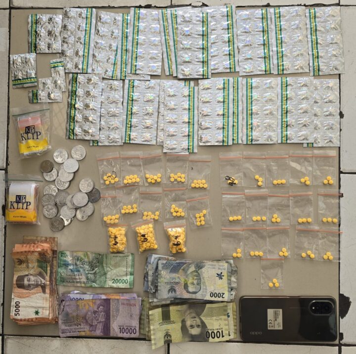 Dalam penggerebekan ini Polisi berhasil mengamankan pelaku berinisial AM (27) berikut barang bukti 225 butir Tramadol, 310 butir Exsimer siap jual serta handphone digunakan untuk bertransaksi dan uang hasil penjualan.