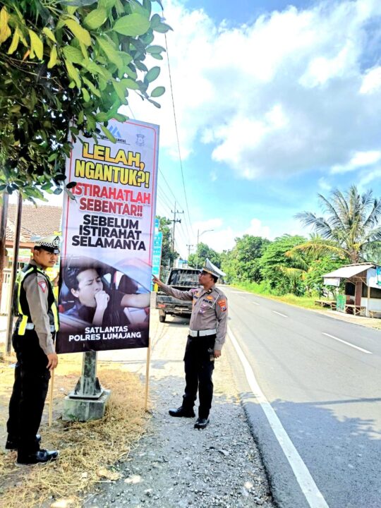 Nasionalpos.com l Lumajang – 13/07/2024, Satuan Lalu Lintas (Satlantas) Polres Lumajang memasang spanduk imbauan di beberapa titik rawan kecelakaan di wilayah Lumajang, Jumat (12/7/2024). Upaya ini dilakukan untuk menekan angka kecelakaan lalu lintas di wilayah tersebut.