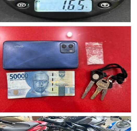 Dalam penggeledahan yang dilakukan secara teliti, petugas berhasil menemukan barang bukti berupa 1 (satu) klip plastik bening berisi kristal putih yang diduga kuat merupakan narkotika golongan I jenis Sabu dengan berat bruto 1,65 gram. Barang haram tersebut ditemukan tersembunyi di bagian stang sebelah kiri sepeda motor pelaku.