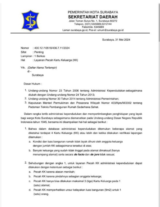 nasionalpos.com ll Surabaya – Surat Sekretariat Daerah Kota Surabaya Nomor 400.12/10518/436.7.11/2024 Hal Layanan pecah kartu keluarga (KK) diprotes dan ditolak oleh Para Ketua RW yang tergabung didalam wadah *Forum RW Kelurahan Simolawang*.