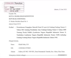 NasionalPos.com, Jakarta– Dua warga Indonesia asal Nias dan Yogyakarta, Eliadi Hulu dan Saiful Salim menggugat Undang-Undang Nomor 2 Tahun 2011. Tentang Perubahan Atas Undang-Undang Nomer 2 Tahun 2003 Tentang Partai Politik (UU Parpol). Gugatan dilayangkan ke Mahkamah Konstitusi (MK) pada 21 Juni 2023, Eliadi dan Saiful mempersoalkan masa jabatan ketua umum (ketum) parpol. Mereka meminta, …