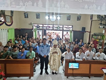 NasionalPos.com, Pontianak-Masih dalam suasana Natal 2022, pada Kamis 29 Desember 2022, kembali Uskup Agustinus merayakan Natal Bersama di Gereja Oikumene Rumah Tahanan Negara Kelas II A Pontianak, bersama Rombongan Keuskupan, Ketua PSE Keuskupan Agung Pontianak Pastor Surip Pr, tim Komsos, Suster Dominikan dan Dominikan Awam. Kemeriahan Natal Bersama itu didukung pula oleh cuaca yang membawa angin sepoi-sepoi memenuhi ruang Gereja yang mungil di Rutan.