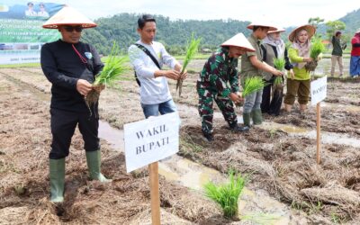 Setelah memberikan sambutan, Wabup Risnaldi langsung turun ke sawah dan ikut menanam padi bersama petani, OPD terkait, dan brigade pangan.